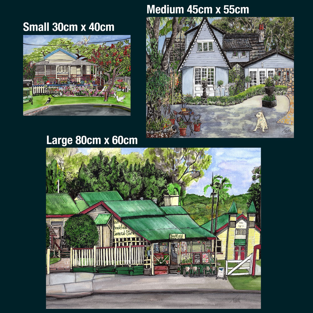 House and Garden portraits capture both the home and the garden in detail. Each illustration conveys the presence of the whole structure in the street or on the property. Every portrait is handled with detail and care, showing every detail, past and present. They are visual maps of time, history and the story of your most special place - home.
